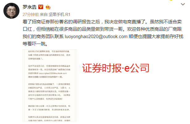 当日下午,罗永浩通过实名认证微博公开发文表示,看了招商证券那份著名的调研报告之后,我决定做电商直播了。