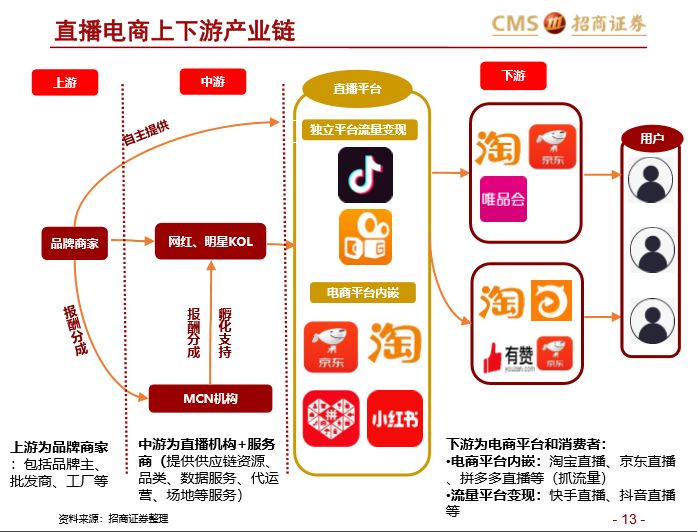根据对产业链上下游及互联网巨头分析,招商证券认为直播电商作为电商代运营的一种方式,平台最先受益。其次,由于产业链上下游分散且充分竞争,具有供应链优势、规模人设打造的MCN或将胜出。