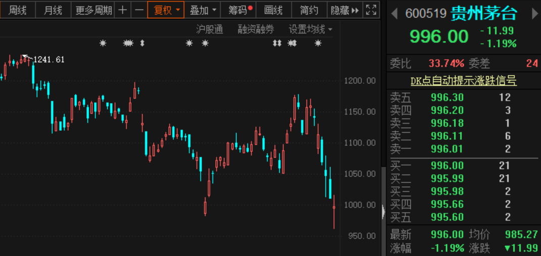 另外,在茅台股价下破1000的同时,市场上茅台酒(53度飞天茅台)价格也再次回到2000以下。