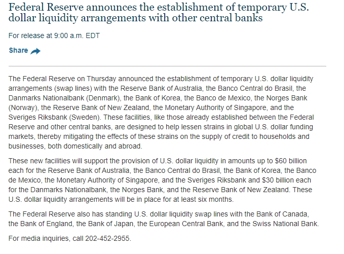 据美联储网站,美联储周四宣布与澳大利亚储备银行、巴西中央银行、丹麦国家银行、韩国银行、墨西哥银行、挪威银行、新西兰储备银行、新加坡金融管理局和瑞典国家银行建立临时美元流动性安排(掉期交易),旨在减轻全球美元融资市场的压力,从而减轻这些压力对国内外家庭和企业信贷供应的影响。