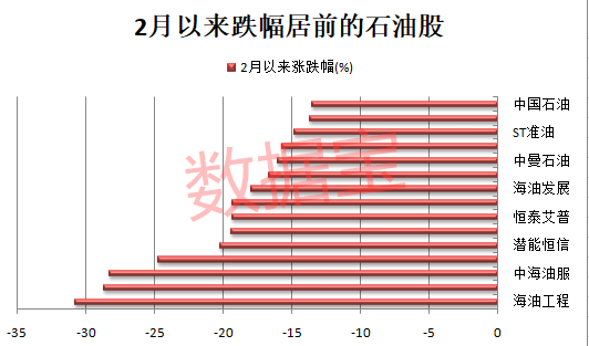 受原油价格持续下跌影响,A股石油板块指数一路下行,最新指数已创十三年来新低。石油行业龙头中国石油昨日下跌1.41%,创下历史新低,总市值降至8329亿元。除中国石油外,通源石油、恒泰艾普、海油发展昨日也同步创下历史新低。2月以来,石油板块上市公司中,共有20股累计跌幅超过10%,其中海油工程、博迈科、中海油服、通源石油、潜能恒信等5股累计跌幅超过20%。