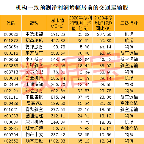 在众多交通运输类公司中,按照5家以上机构一致预测数据,18家公司今年净利润一致预测增幅超过10%。净利润预测增幅最高的是中远海能,机构一致预测其今年净利润为21.62亿元,同比增长307.69%。招商证券最新研报认为,中远海能专注于油运业务,拥有43条VLCC,船队性能佳,在油运股里资质最好。国际油价大幅下挫,中国有望增加原油战略储备,叠加子公司船舶解禁,中远海能业绩弹性极强。