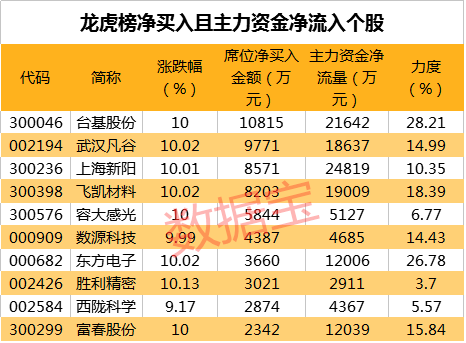 从盘口资金流向来看,主力资金净流入超千万且龙虎榜净买入个股共有14只,其中上海新阳、台基股份、飞凯材料等个股资金净流入金额最大。净流入力度最大的个股有中坚科技、台基股份、东方电子,净流入力度分别为33.86%、28.21%、26.78%。