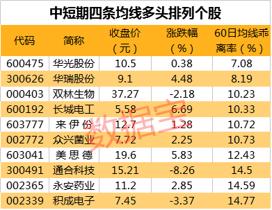 截至最新,45只个股5日、10日、20日、60日四条均线近日呈多头排列。其中华光股份、华瑞股份、双林生物股价与60日均线的乖离率最小,分别为7.08%、8.19%、10.23%。
