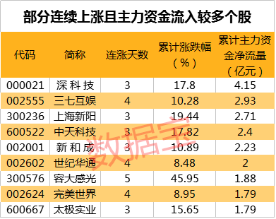 值得注意的是,202只连续上涨个股中,22只个股期间主力资金累计净流入超过亿元。其中,累计资金流入最多的为深科技,主力资金累计流入4.15亿元。