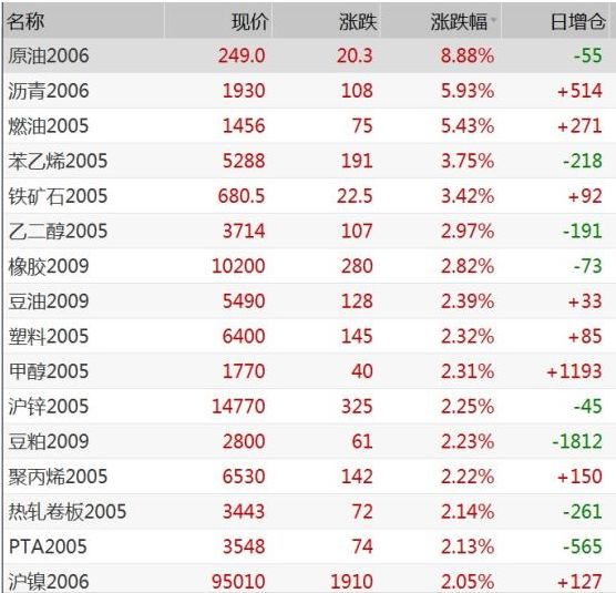 3月20日,国内期市开盘几近全线飘红,原油涨近9%,沥青涨近6%,燃油涨超5%。黑色系多数上涨,铁矿石涨逾3%,热卷涨逾2%,螺纹钢涨逾1%;基本金属多数上涨,沪锌、沪镍涨逾2%,沪铅涨逾1%;贵金属均上涨,沪银涨逾1%;农产品多数上涨,豆油、豆粕涨逾2%,菜油涨逾1%。