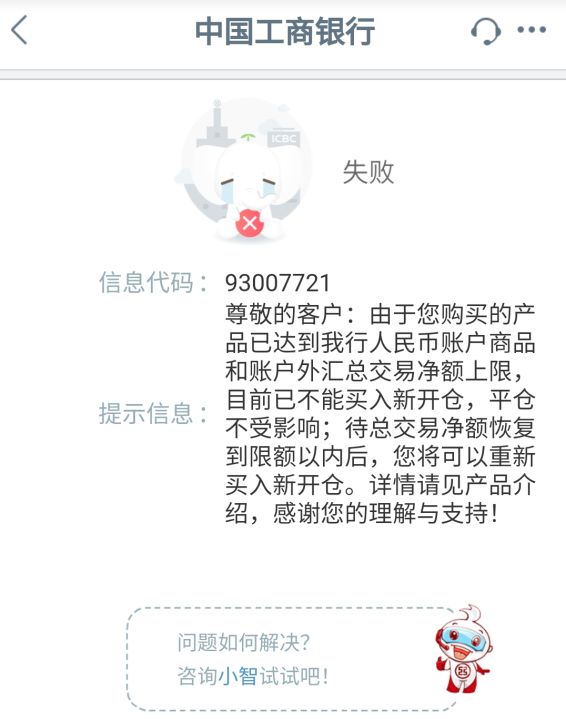 记者在下单确认时,工行APP客服提示称,“由于您购买产品已达到我行人民币账户商品和账户外汇总交易净额上限,目前已不能买入新开仓(做多),平仓不受影响;待总交易净额恢复到限额以内后,您将可以重新买入新开仓。”