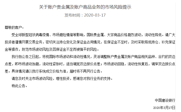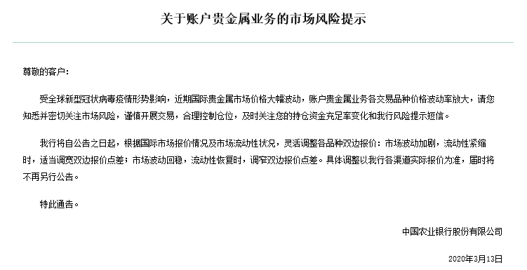 农业银行则在3月13日发布《关于账户贵金属业务的市场风险提示》,称:根据国际市场报价情况及市场流动性状况,灵活调整各品种双边报价。