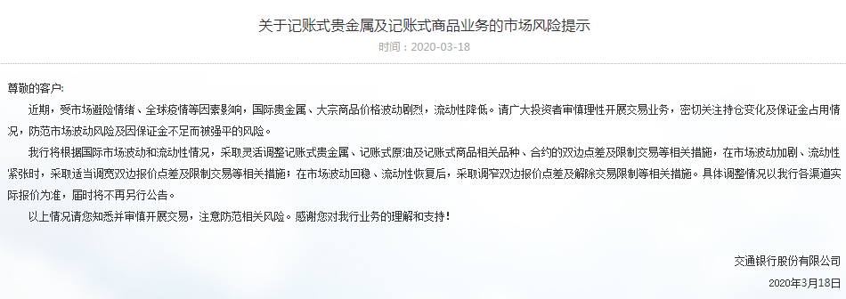 同样宣布将灵活调整账户贵金属及账户商品交易点差的还有建设银行、交通银行。