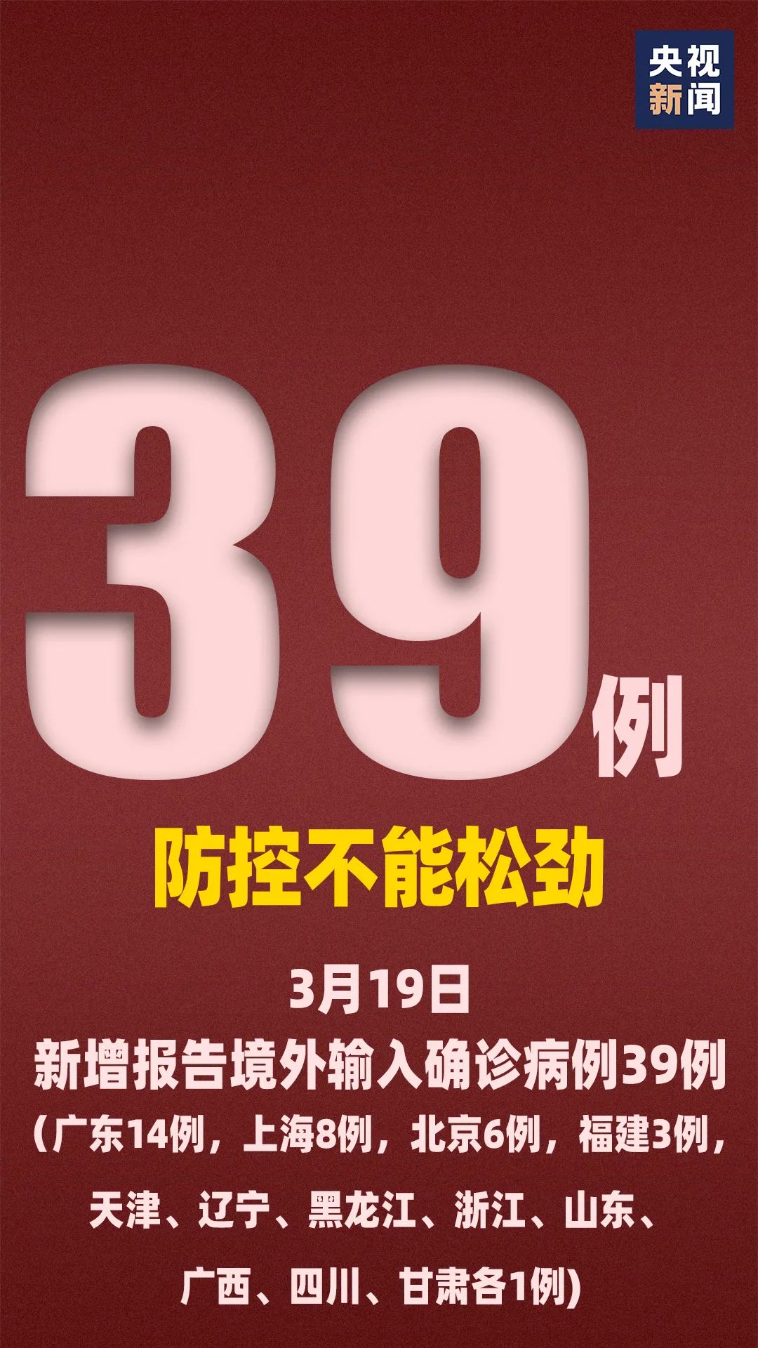 19日0时至24时,新增报告境外输入确诊病例39例(广东14例,上海8例,北京6例,福建3例,天津、辽宁、黑龙江、浙江、山东、广西、四川、甘肃各1例)。截至3月19日24时,累计报告境外输入确诊病例228例。