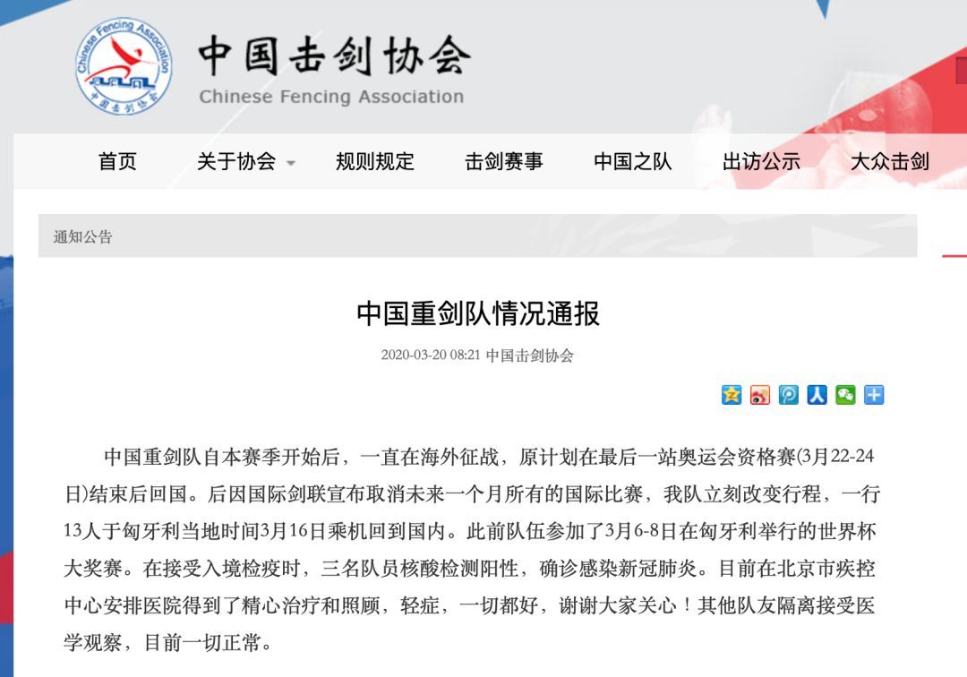 今早(20日),中国重剑队在中国击剑协会官网发布消息,3名国家队队员确诊感染新冠肺炎。这是我国国家体育队首次出现确诊病例。