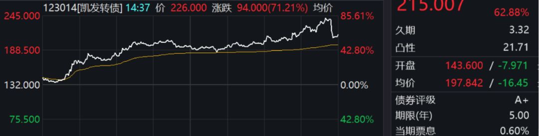 此前一直表现平淡的凯发转债今天开始发力了,开盘后一路上涨,临近尾盘持续拉升,涨幅一度超过80%,达到85.61%,但此后又快速下挫,尾盘4分钟跌了12%,收盘价215.007元,全天涨幅62.88%。盘中价格最高245元,最低135.525元。换手率3299.02%。