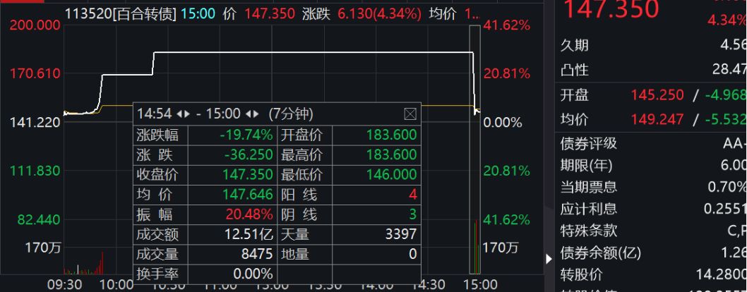 百合转债也是差不多的走势,开盘涨幅飚到20%,第一次临停后很快涨30.01%,触发第二次临时停牌,直到下午2点57分才能再次恢复交易。交易恢复后的三分钟,百合转债直线跳水,尾盘跌幅19.74%,收盘价格为147.35元,收盘涨幅4.34%。