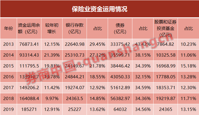 据中国银保监会数据,截至2019年12月末,保险资金运用余额18.52万亿,其中6.4万亿元投资于债券,2.52万亿元投资于银行存款,2.44万亿元投资于股票和证券投资基金。权益投资占比13.15%,这一比例已升至三年来最高点。