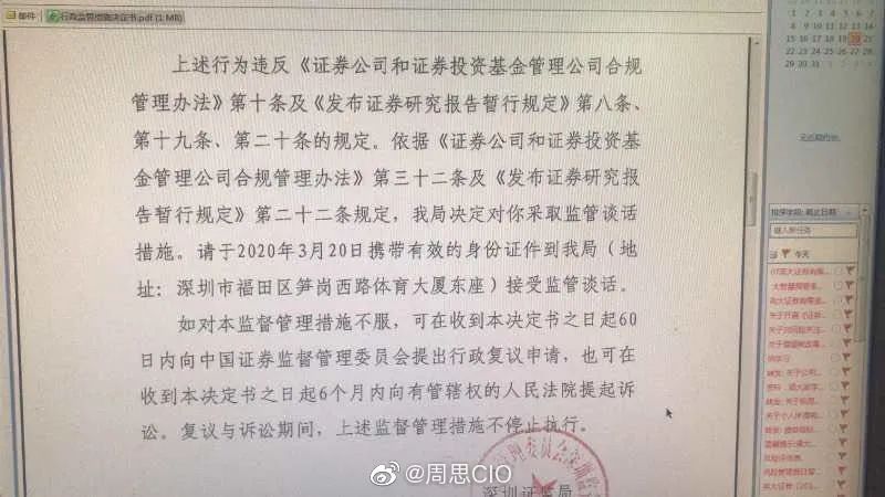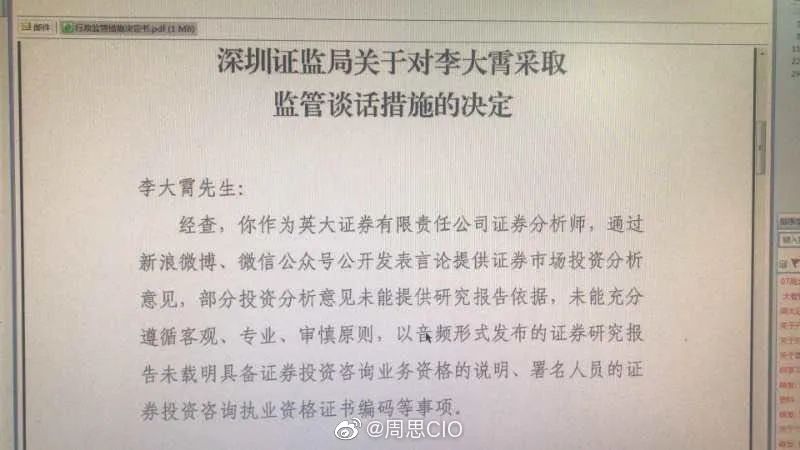 今天,一份《深圳证监局关于对李大霄采取监管谈话措施的决定》的文件在网上广泛流传。