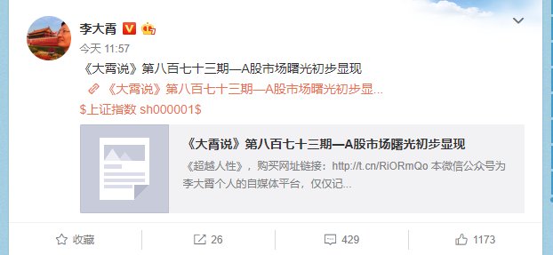 3月5日,李大霄发文:《李大霄谈李大霄:每个被骂的人心都会滴血,但我依然唱多。》