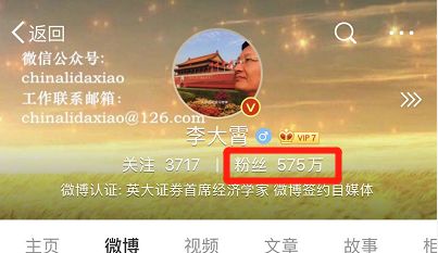 李大霄微博有575万粉丝,微博简介是这么描述的:“钻石底亮晶晶,地球顶沉甸甸,婴儿底抱紧紧。做好人,买好股,得好报。”