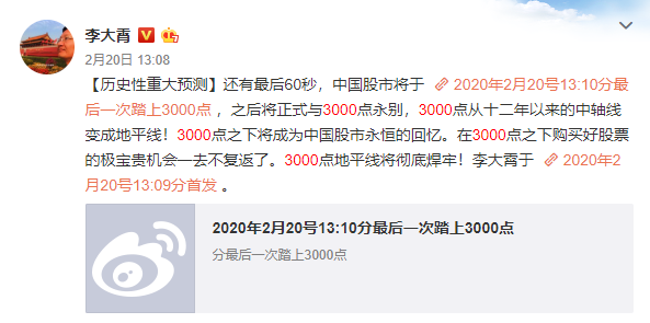 而回看过去一周,李大霄的微博,已不再提各种底部,也不再发表类似“焊牢3000”的预测了。