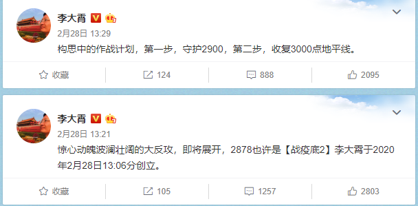 2月28日,他提出【战疫底2】:惊心动魄波澜壮阔的大反攻,即将展开,2878也许是【战疫底2】李大霄于2020年2月28日13:06分创立。