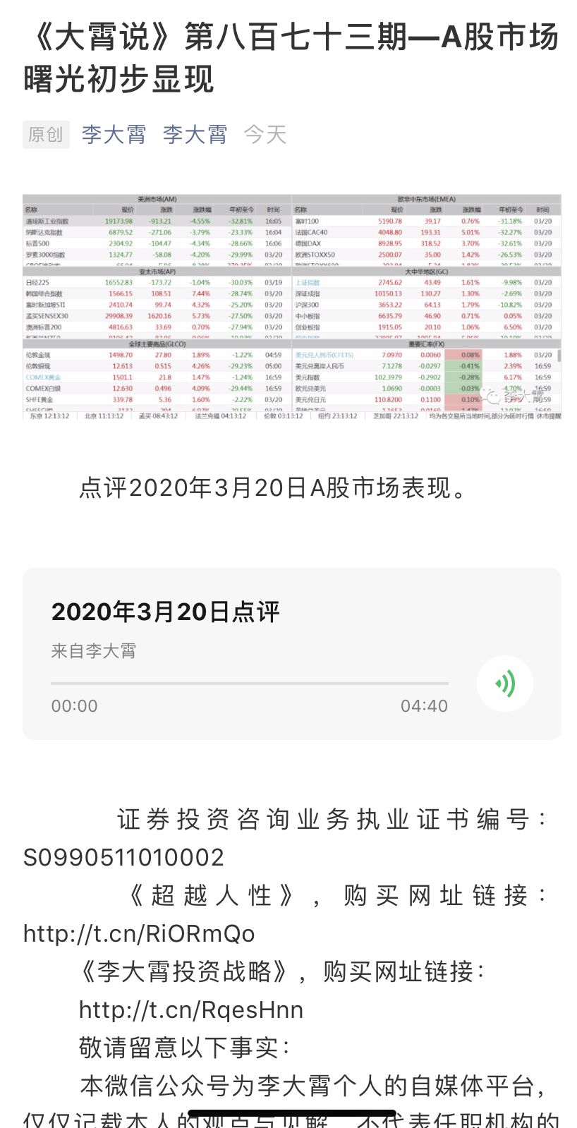 李大霄一直以来坚持在微信公众号“李大霄”上发布音频股评,最近一篇是在21日上午11点55分发布的,主题是点评2020年3月20日A股市场表现,只有一张行情软件截图和一个将近5分钟的音频,没有研报、没有图表。