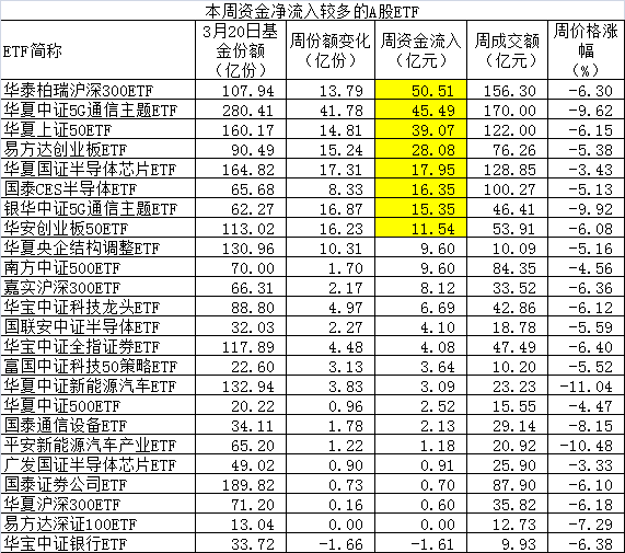 数据显示,华泰柏瑞沪深300ETF、华夏上证50ETF、易方达创业板ETF三只基金,三月份以来净流入资金分别为63.45亿元、58.23亿元、12.82亿元,同样位居排行榜前列。