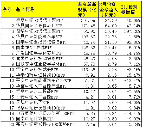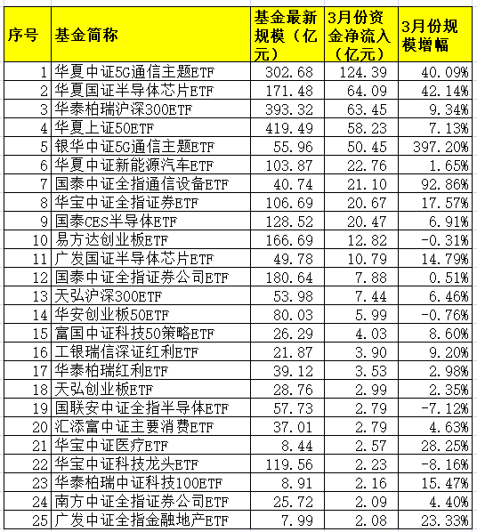 其中,华夏中证5G通信主题ETF净流入资金124.39亿元,成为三月股市调整期间最为吸金的股票ETF,该只基金规模也从2月底的216.06亿元增至302.68亿元,成为首只规模破300亿元的行业ETF。华夏国证半导体芯片ETF、华泰柏瑞沪深300ETF两只基金净流入也超过60亿元,分列2、3名。