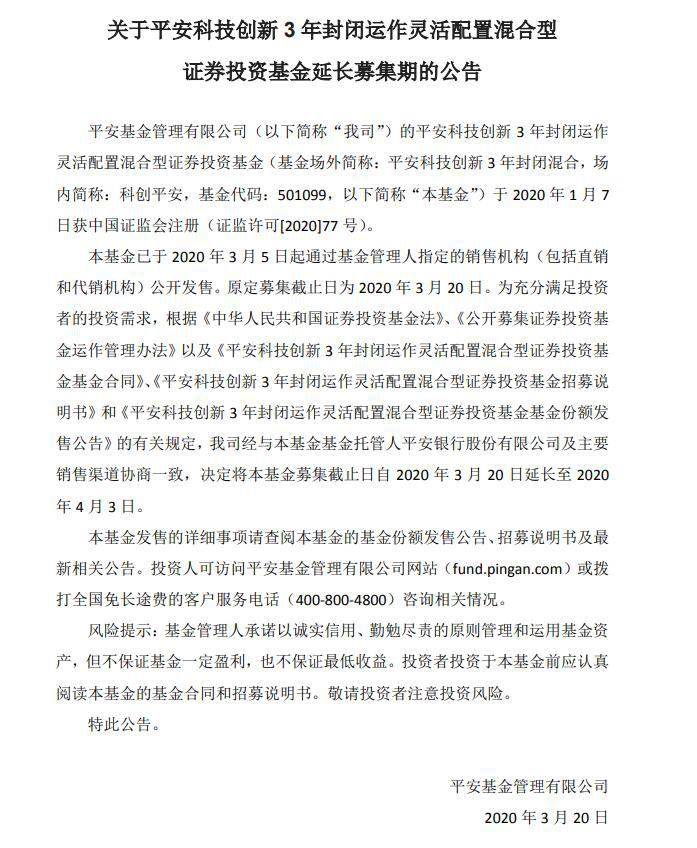 平安基金3月20日发布公告,已于 2020 年 3 月 5 日起通过基金管理人指定的销售机构公开发售。原定募集截止日为 2020 年 3 月 20 日。现平安基金经与基金基金托管人及主要销售渠道协商一致,决定将平安科技创新三年基金募集截止日由 2020 年 3 月 20 日延长至 2020 年 4 月 3 日。