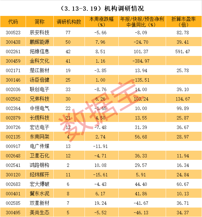 近一周机构调研个股数量有34只,辰安科技成为近一周调研机构数量最多的股票。