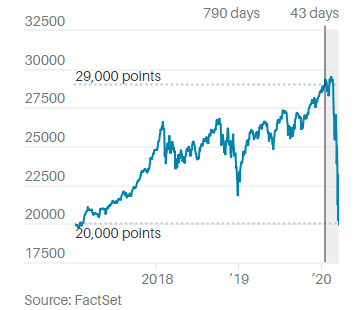 道指花了790个交易日,从20000点攀升到29000点,但是之后,只用了43个交易日跌了回去。
