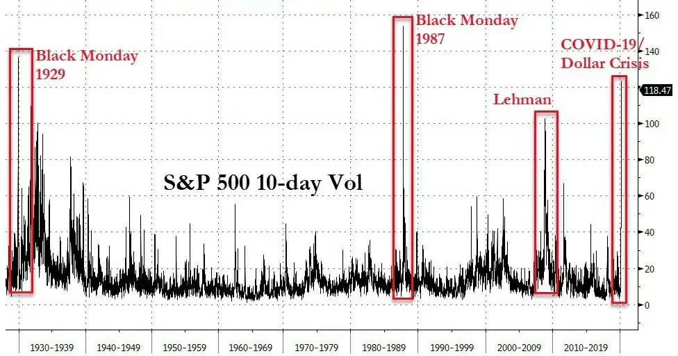 同时,市场波动率也在进一步攀升,下图为过去两周波动率情况。本轮美股波动率的上升幅度已经超过了2008年雷曼倒闭时刻,仅次于1929年大萧条时期和1987年“黑色星期一”。