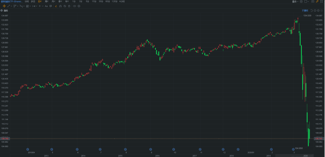 上图为,美国投资级别公司债券ETF(代码: LQD),单周跌幅达到了13.25%,创下历史纪录。