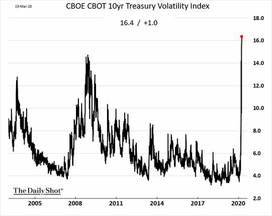 在市场跌幅加大的同时,债券市场波动率也明显上升,芝加哥期权市场(CBOE)10年期国债波动率指数,也创下历史新高。