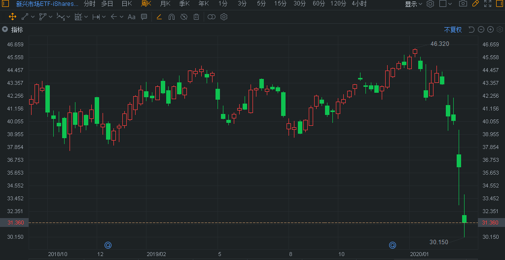在新兴市场股票指数基金(代码:EEM),在上周暴跌10%之后,本周跌幅进一步扩大,达到13.23%。
