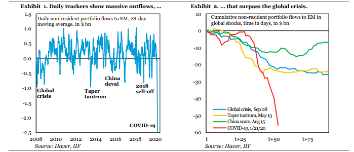 同时,根据 国际金融协会(IIF)的统计显示,实时追踪中看到了新兴市场有非常大的资本流出。新兴市场资本流动受到的冲击已经比2008年金融危机时期更为严重,甚至令1997-98年亚洲危机和2013年的紧缩恐慌(taper tantrum)等压力事件相形见绌。