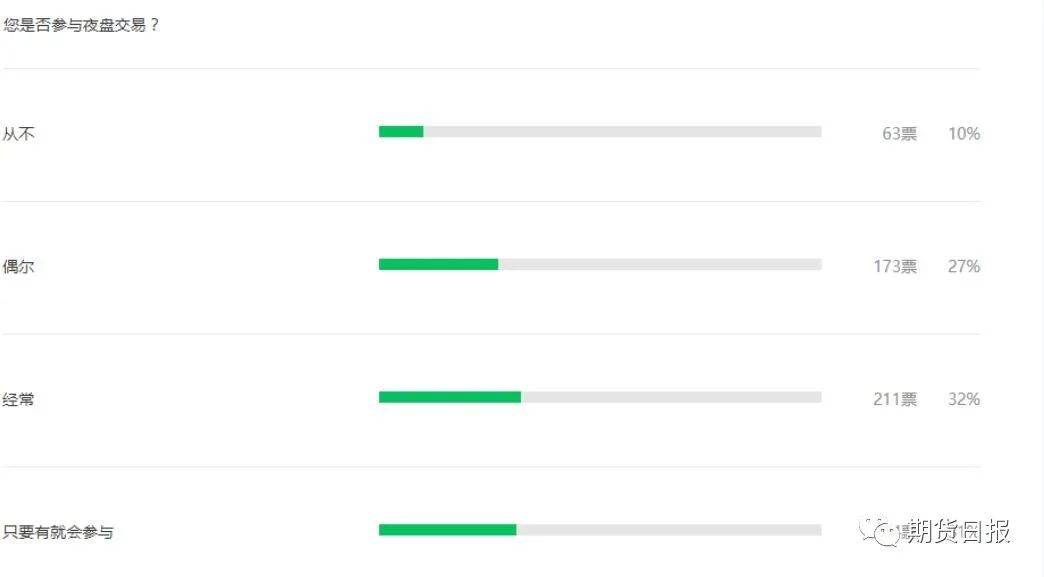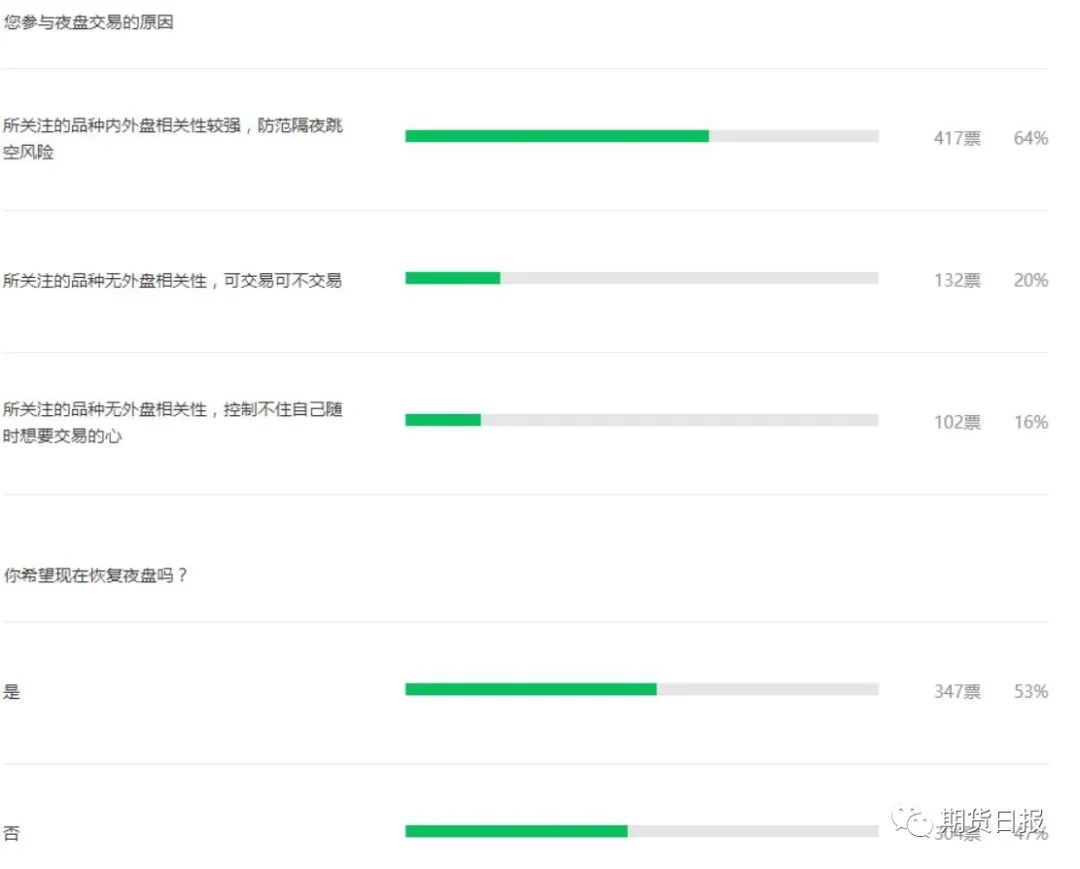 就是否希望恢复夜盘交易的问题,参与调查的651位投资者,53%希望恢复夜盘,剩下则不希望恢复。