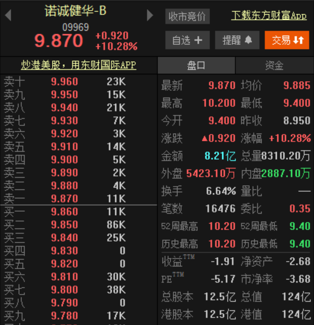 诺诚健华上市首日逆市高开9.4港元,较发行价上涨5.03%。截至发稿,其股价涨幅为11.17%,最新市值为124.50亿港元。