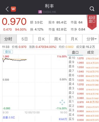 今日开盘,港股三大股指悉数走低,但利丰受上述消息提振,逆势大涨94%,盘中一度涨至116%,创近半年新高。截至午间收盘,报0.97港元,最新总市值为82.8亿港元,成交额达3.46亿港元。