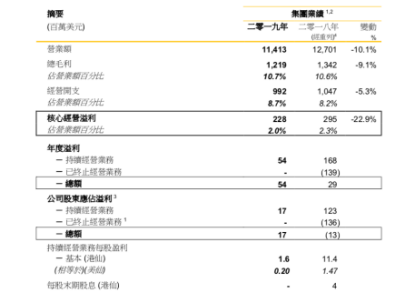3月20日,利丰发布了2019年度业绩,公告显示该集团于年内营业额为114.13亿美元,同比减少10.1%。总毛利为12.19亿美元,同比减少9.1%。核心经营溢利为2.28亿美元,同比减少22.9%。公司股东应占溢利为1700万美元,而上年同期取得亏损1300万美元。每股基本盈利为0.20美仙,不派息。