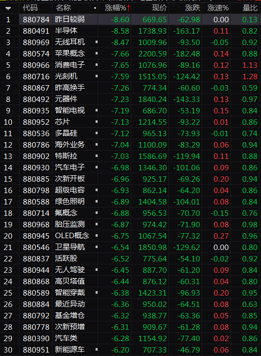 盘后数据显示,半导体板块跌幅最凶,跌幅高达8.58%。此外,无线耳机、苹果概念、消费电子三个板块跌幅紧随其后,分别大跌8.47%、7.66%、7.65%。光刻机概念、元器件、芯片、汽车电子四个板块也是惨不忍睹,跌幅均超过6.9%。