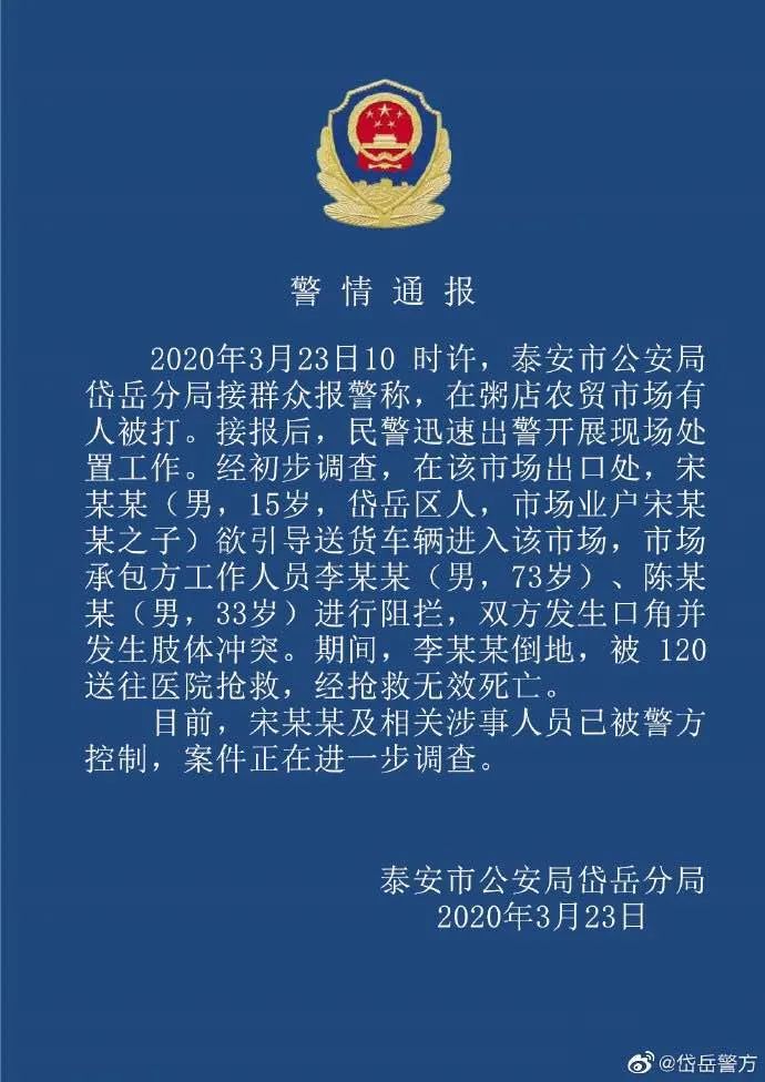 2020年3月23日,山东泰安,一农贸市场内发生一起强闯疫情防控卡点并殴打工作人员事件。据悉,被殴打的疫情防控卡点工作人员已死亡。@岱岳警方 发布警情通报称,相关人员已被控制。