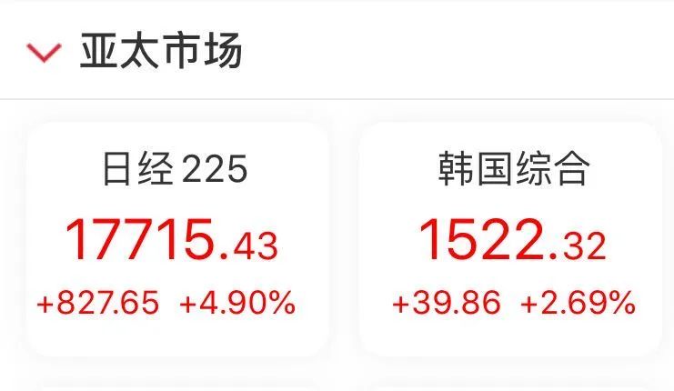 24日早盘,日经225指数高开1.89%,韩国KOSPI指数开盘上涨3.07%。随后,日经225指数高开高走,涨幅扩大近5%。