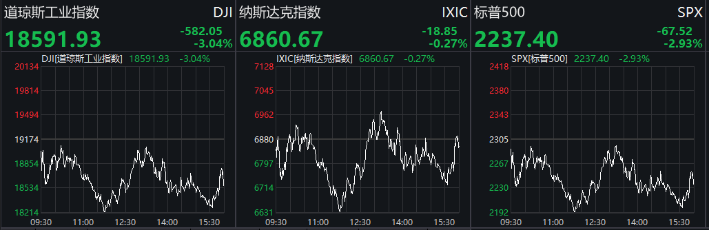 道琼斯指数周一下跌582.05点,跌幅3%,并继续追赶自1931年以来最糟糕的份月。标普500指数下跌2.9%至2237,较上个月创下的纪录高位收盘下跌34%。除日本股市以外,全球市场几乎全线下挫。