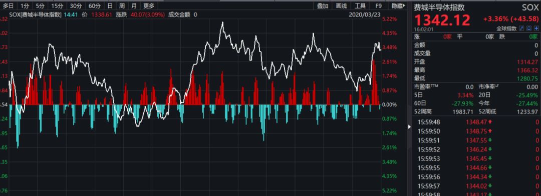 美国大型科技股多数收跌,苹果跌2.12%,亚马逊涨3.07%,奈飞涨8.24%,谷歌跌1.32%,Facebook跌1.09%,微软跌1%。但值得关注的是,费城半导体指数逆市大涨。