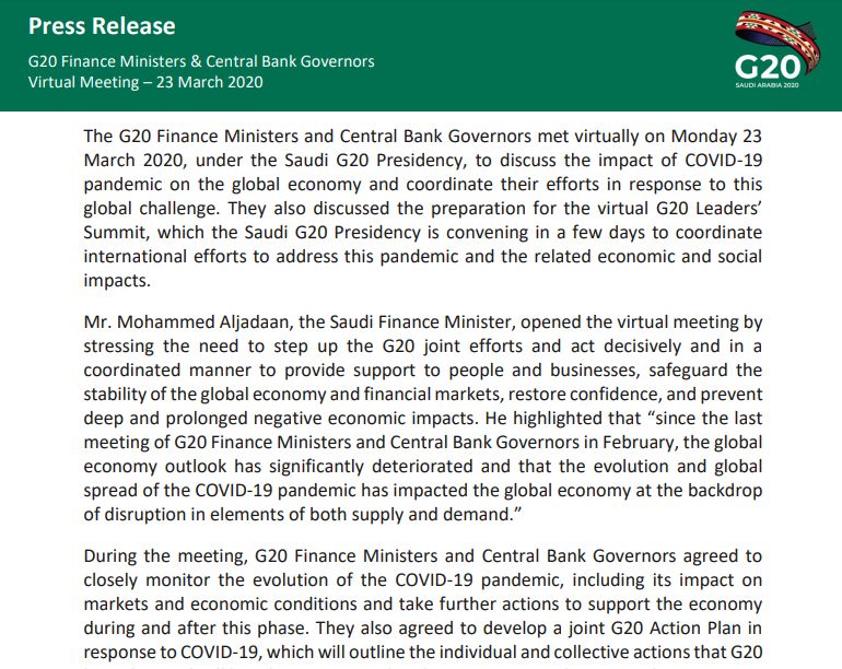 会议期间,20国集团财长和央行行长同意密切监测COVID-19大流行的演变,包括其对市场和经济状况的影响,并采取进一步行动,支持在此期间和之后的经济发展。他们还同意制定一项针对COVID-19的联合行动计划,其中将包括20国集团为应对COVID-19大流行病已经采取和将采取的个人和集体行动。