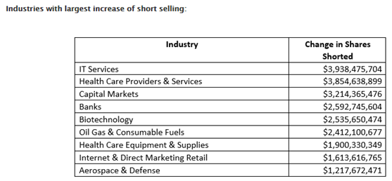 根据S3数据,卖空增加最多的行业是技术服务业,达到39.4亿美元,其次是医疗保健服务业,卖空交易增加了38.5亿美元。券商等资本市场行业公司的卖空交易增加了32亿美元,对银行的卖空交易增加了约26亿美元。对生物技术业的卖空交易增加了25亿美元。卖空交易量增幅居前的公司包括苹果、微软、McKesson Corp、Visa Inc、摩根士丹利(Morgan Stanley)、迪士尼(Walt Disney)和康卡斯特(Comcast Corp.)