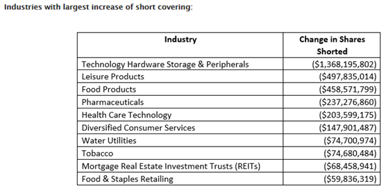 截至3月19日,空头回补增幅最大的行业是科技硬件和休闲产品类股,前者有14亿美元的股票被卖空,后者增加了4.978亿美元。此外,医药和医疗保健类股均出现2亿美元以上的空头回补。