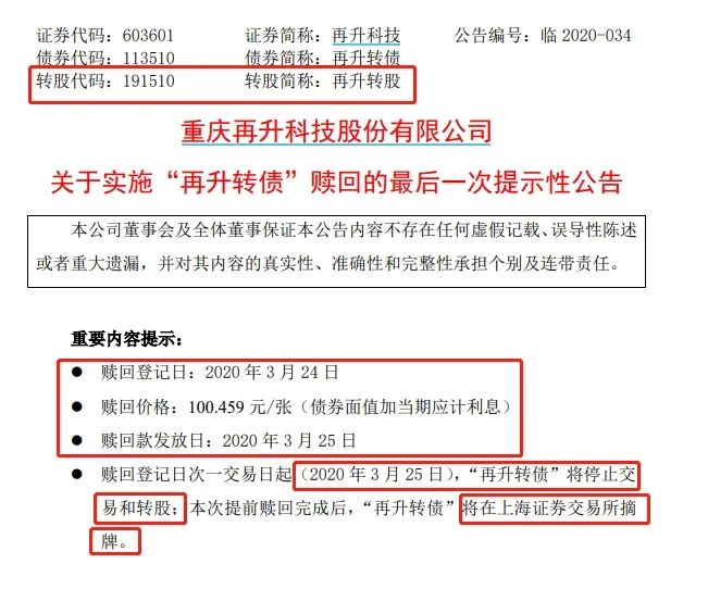 由于连续 30 个交易日中有 15 个交易日的收盘价格不低于公司再升转债当期转股价格的 130%,再升转债在3月9日触发强赎机制,而后再升转债连发6次强赎提示性公告,3月24日为赎回登记日,3月25日为赎回款发放日。
