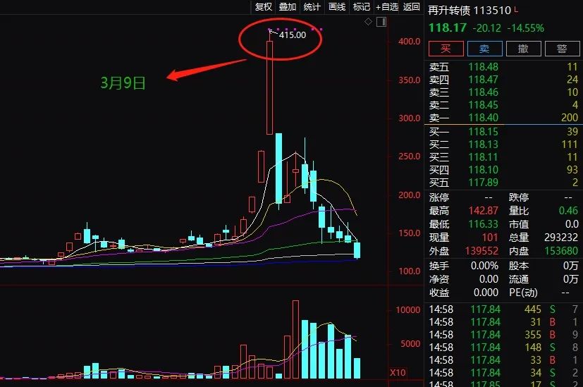 再升转债因为近期波动异常激烈,是市场非常关注的一只可转债,3月9日价格最高冲到415元,11个交易日内暴涨204%,更有一个交易日成交28亿元天量。然后在3月9日触发强赎后,价格一路回落,并将在今天收市后因强赎回归“百元面值”。