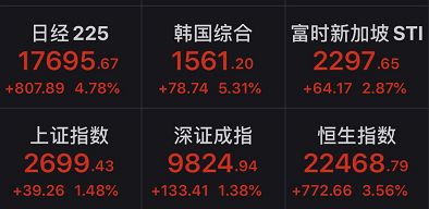 日本TSE REIT指数期货上涨,触发熔断机制;韩国也因短期涨幅过大,暂停KOSDAQ市场的程式交易买单。截至发稿,日经225指数涨4.78%,盘中一度创出2016年11月以来的最大涨幅,其中软银股票受到公司资产出售和股票回购计划的推动盘中一度暴涨21%,创历史最大单日涨幅;韩国综合指数涨5.31%。