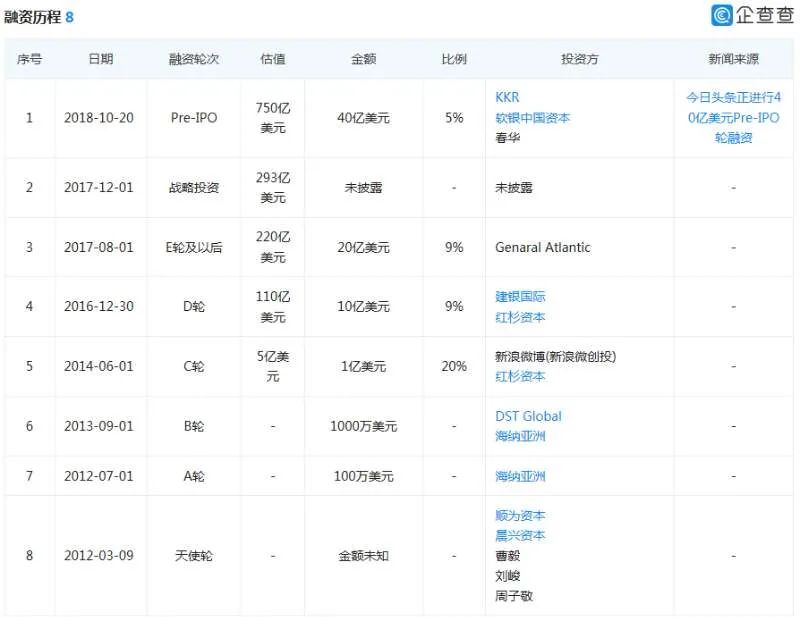 今日头条融资历程 来源:企查查